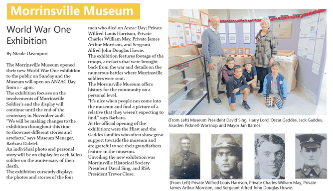 The exhibition currently displays the photos and stories of the four men who died on Anzac Day; Private Wilfred Louis Harrison, Private Charles William May, Private James Arthur Morrison, and Sergeant Alfred John Douglas Howie.