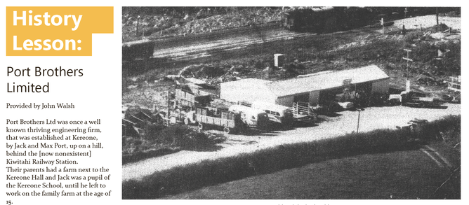 Port Brothers Ltd was once a well known thriving engineering firm, that was established at Kereone, by Jack and Max Port, up on a hill, behind the [now nonexistent] Kiwitahi Railway Station.